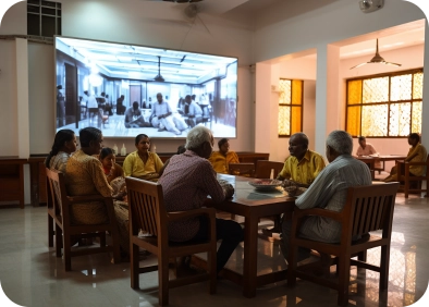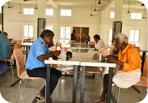 Sunshine Old Age Home has a bigger dining hall, where 200 people can have dining at times. The dining hall is well-lit and well-ventilated with chairs and tables, food serving area, RO water provision, washing area for the elderly to sit and eat comfortably.
